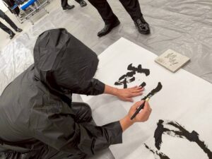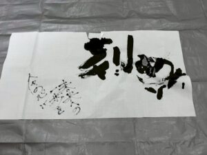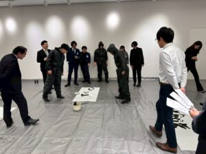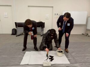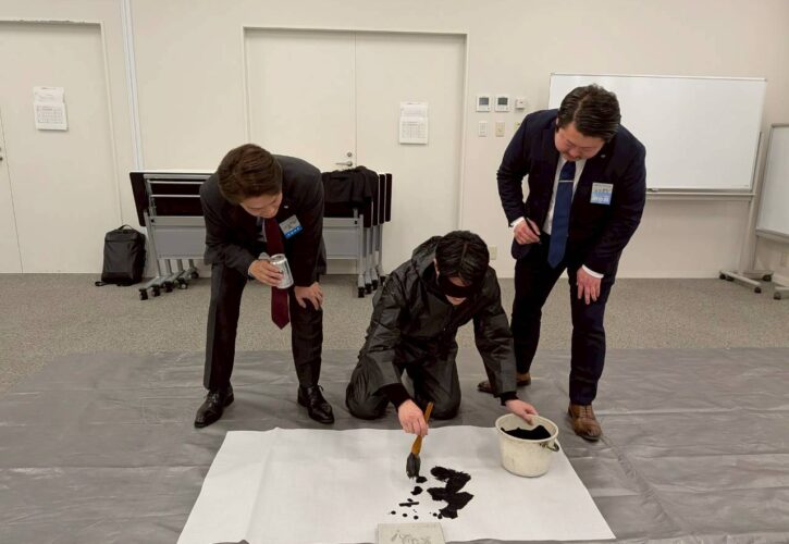 新年祝賀会ではアトラクションで目隠し書初めを行いました。