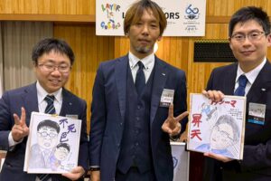 毎月恒例の誕生祝いですが、平野理事長直筆のエッジの効いた、素敵な似顔絵が伊藤君、足田君に、平野理事長には足立君よりプロ級(?)の似顔絵がプレゼントされました。